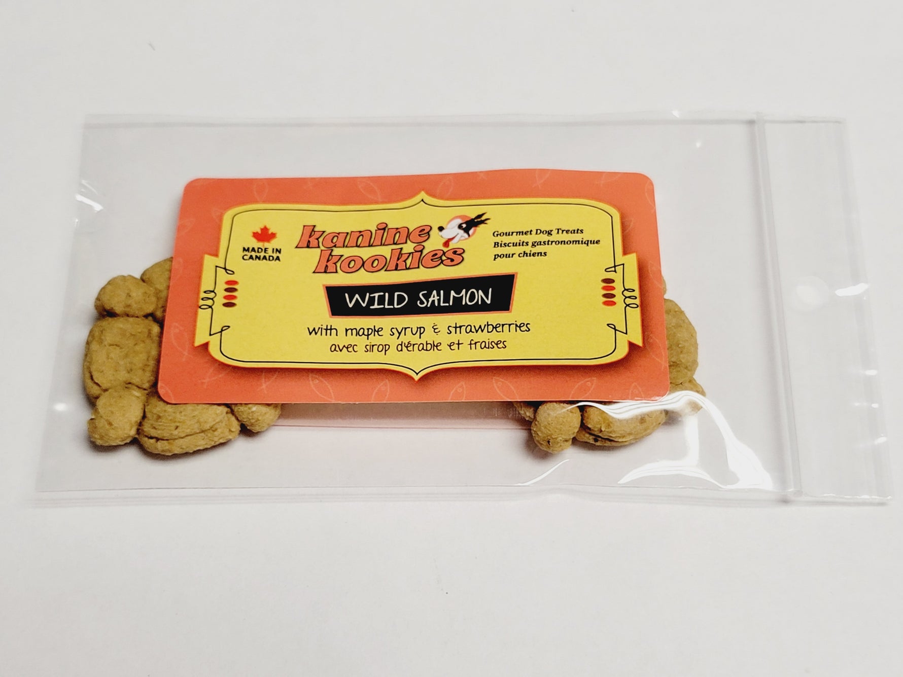 Unit price perWild Salmon Treats are a symphony of flavors and nutrients that redefine canine indulgence. Packed with omega-3 fatty acids from salmon and sardines, these treats support a lustrous coat, joint health, and cognitive function. The addition of flax seeds helps boost the omega-3’s and are fiber-rich, aiding digestion and promoting a healthy weight. Strawberries infuse a burst of antioxidants, contributing to immune support and a tasty sweetness, while a touch of maple syrup adds a delightful hint of natural sweetness, as well as manganese, zinc, Vitamin B2 and, anti-microbial and possible cancer-fighting agents. With a harmonious blend of wholesome ingredients, our Wild Salmon Treats offer a delightful snacking experience that goes beyond taste, providing a myriad of health benefits for your furry friend. Treat your pup to this flavorful fusion where health meets happiness in every delicious bite!