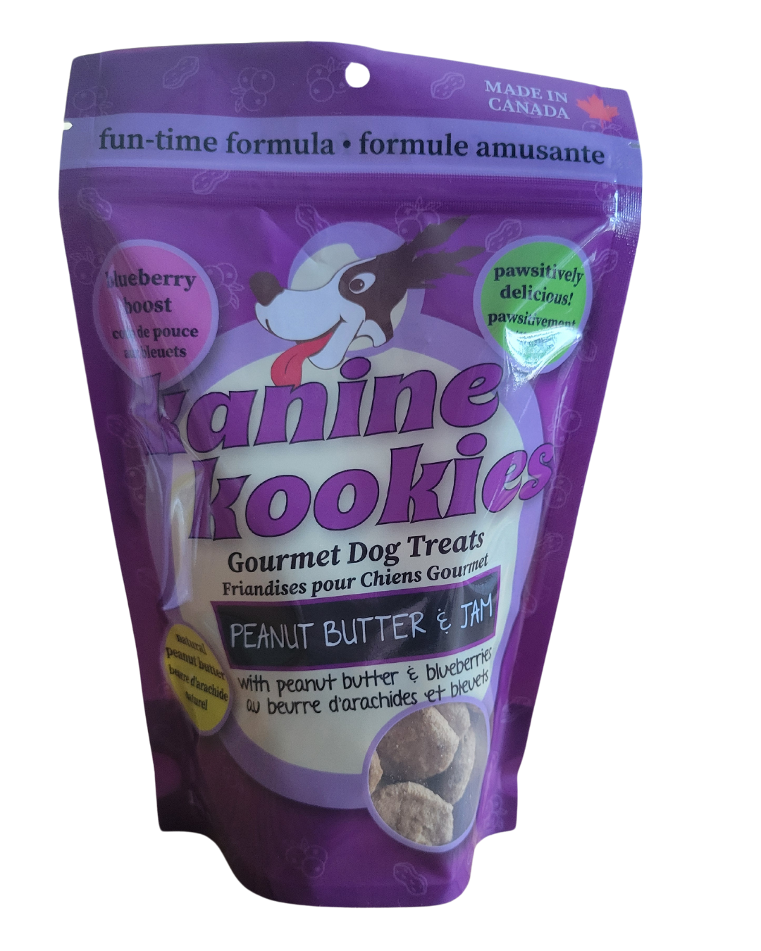 Add the yumms to your puppers snack attack with Kanine Kookies Peanut Butter & Jam treats! This "Fun-Time Formula" combines the irresistible taste of peanut butter with the wholesome goodness of blueberries, creating a treat that's both delicious and nutritious.